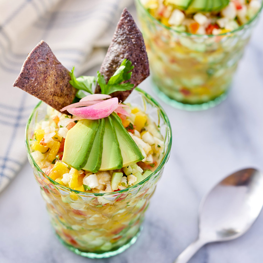 2. Picamos el mango, la jícama, los tomates, el aguacate en cubos pequeños y los agregamos al pescado. Cortamos el cilantro y la menta en tiras delgadas; agregamos junto con el chorrito de Vainilla Molina al pescado. Salpimentamos y rectificamos el sazón. Refrigeramos durante 15 minutos.