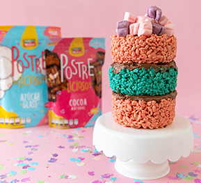5. Arma el pastel colocando una capa de la base de arroz inflado, después una capa de frosting y después otra de arroz inflado, hasta alcanzar la altura deseada.