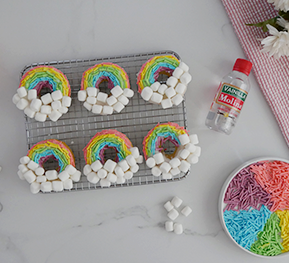 Agrega malvaviscos mini a la mitad de las donas y la otra mitad la cubres con sprinkles de colores para formar un arcoíris.