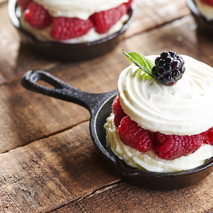 - Repartimos sobre cada base de merengue un poco de la crema de Vainilla Molina y frutos rojos.
