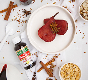 2. En una olla mediana, agrega el vino tinto, el azúcar, el jugo de naranja, el jugo de limón, el chorrito de Vainilla Molina y las varas de canela hasta que empiece a hervir.