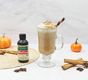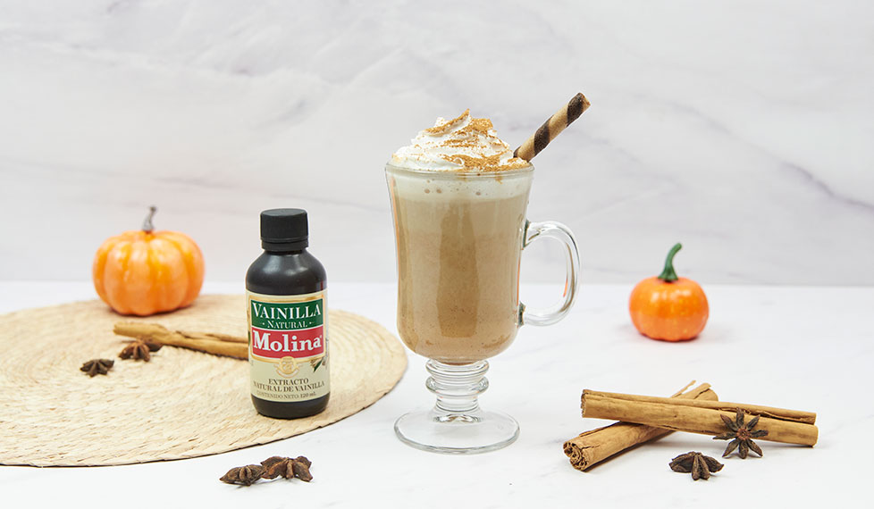 Licúa la leche, el puré de calabaza, el azúcar, la crema de vainilla, la especia de calabaza y un chorrito de Extracto Natural de Vainilla Molina.