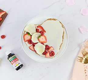 Tarta de chocolate blanco con frutos rojos y pétalos de rosas