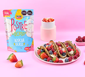 Sirve los tacos en un plato, puedes usar más frutas de temporada para sostener los hot cakes y que mantengan su forma.